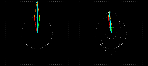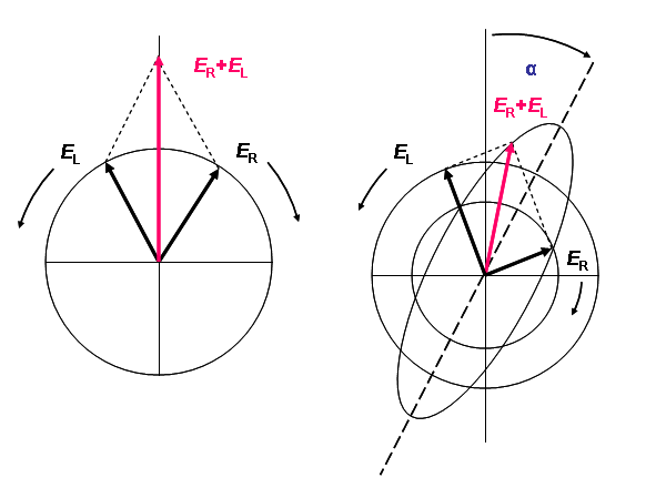 - Left: The two waves after passing through an absorbing medium with different magnitudes between the waves, hence resulting in ellipticity.