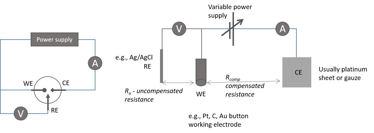 - Uncompensated resistance: The resistance between the RE and WE multiplied by the current between WE and CE, resulting in a difference between the measured and actual potential. It can be reduced by:
