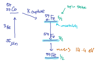 results in a metastable excited state of , leading to a cascade of transitions, with one at keV, close to the absorbing energy for .