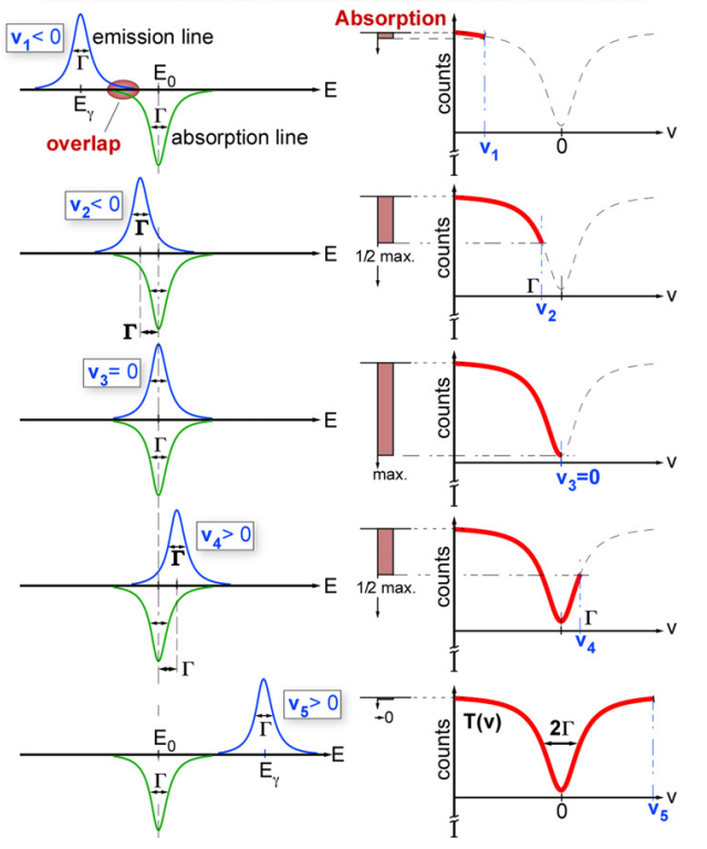 - The source is moved at Doppler velocities, and absorption probability is measured at each velocity by the overlap of the Doppler-shifted emission line with the absorption line.
